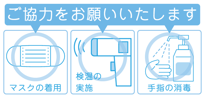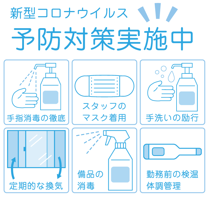 当店では、新型コロナウイルス感染症に対するお客様と従業員の安全の確保を最優先に考え、以下の予防策に取り組んでおります。感染拡大防止に何卒ご理解ご協力を賜りますようお願い申し上げます。